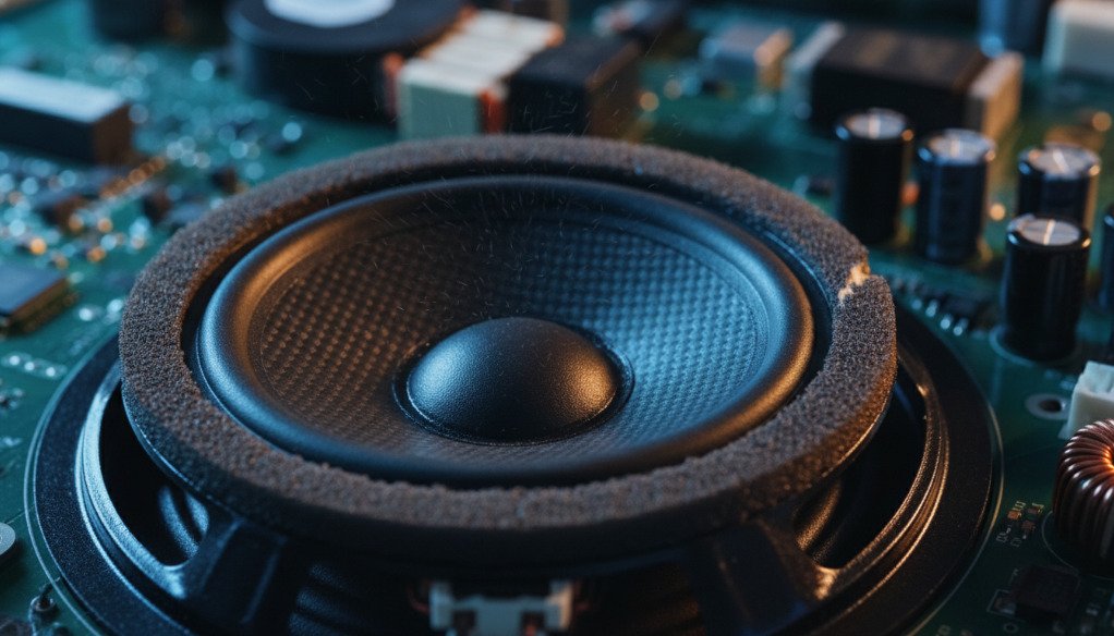Диффузор (мембрана, которая толкает воздух) крепится к корзине динамика эластичным кольцом — подвесом. В бюджетных и даже премиальных ТВ этот подвес часто делают из пенополиуретана (ППУ). Материал легкий, дешевый, но недолговечный. Спустя 5–7 лет под воздействием тепла он высыхает и превращается в липкую труху.