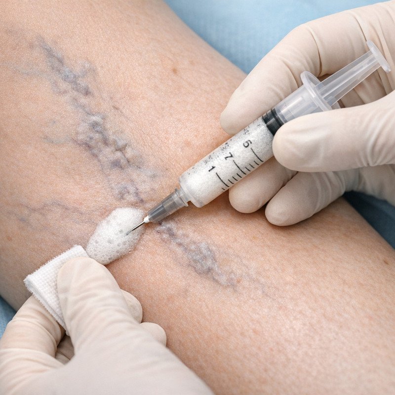 Склеротерапия — один из самых доступных и широко применяемых малоинвазивных методов лечения варикоза, особенно на ранних стадиях заболевания. В отличие от тепловых технологий (лазера и радиочастоты), здесь используется специальный препарат — склерозант, который вводится внутрь вены и вызывает её «склеивание».